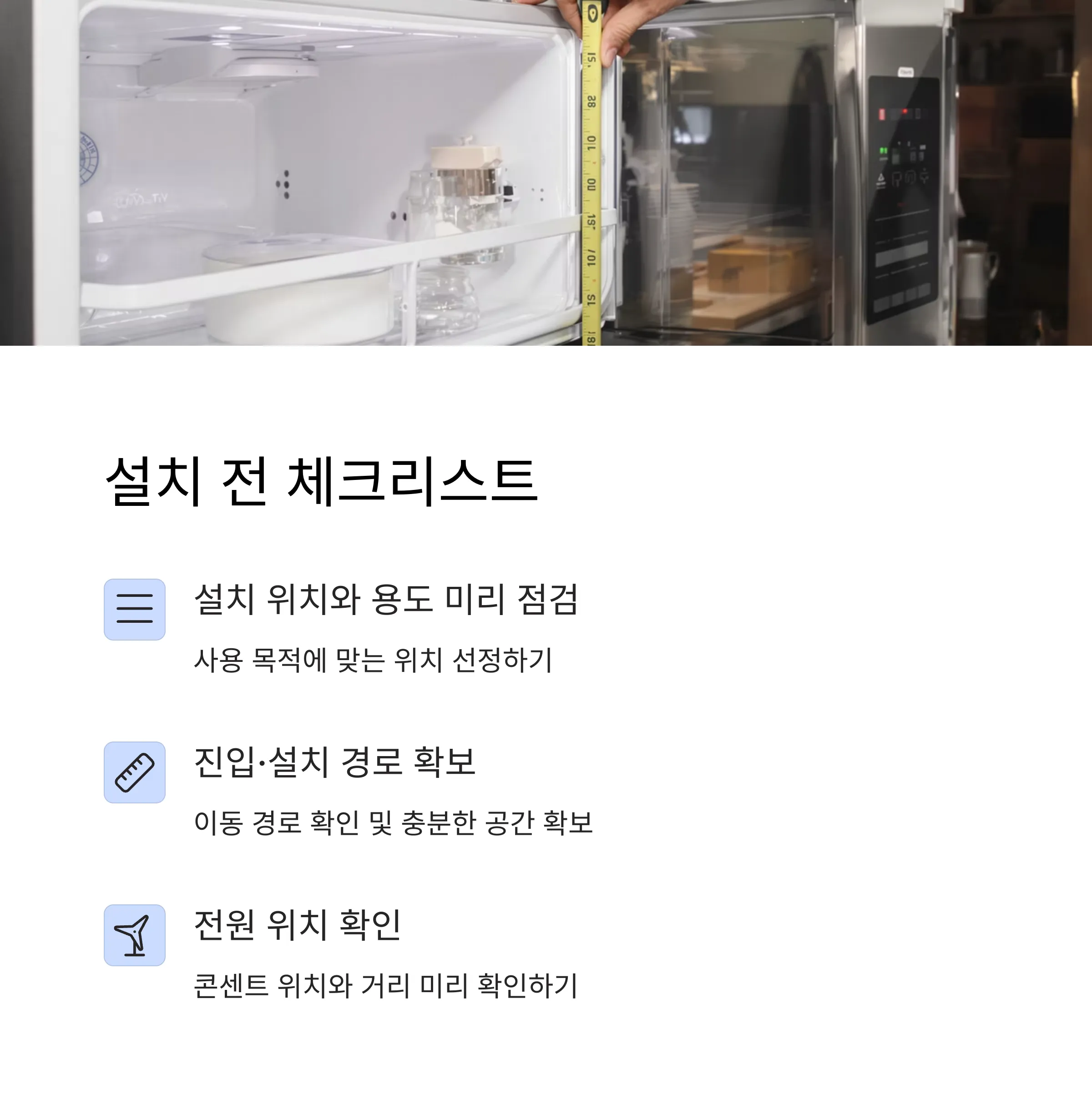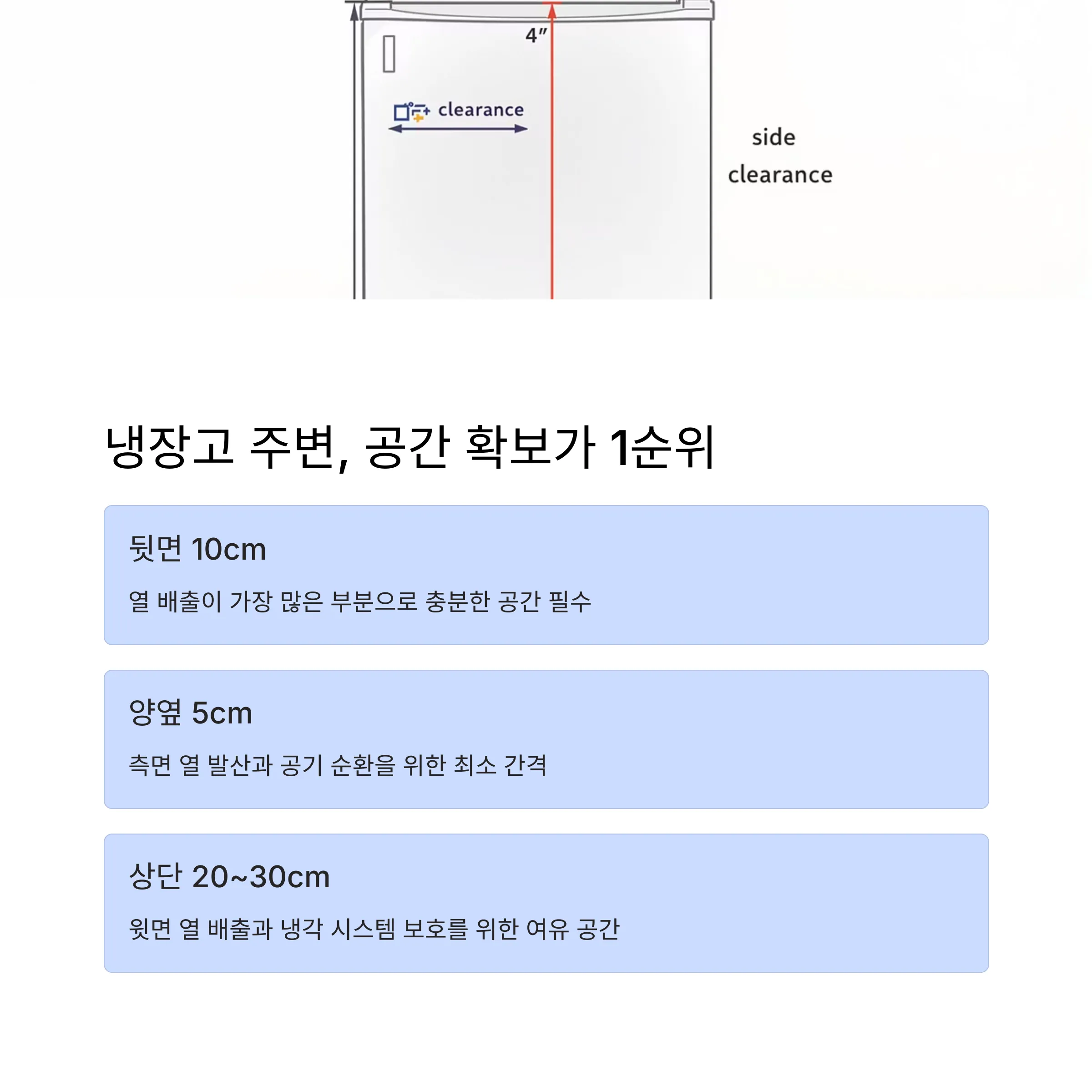 | 냉장고 상단 | 20~30cm 이상 | 열 상승에 필요한 공간 |