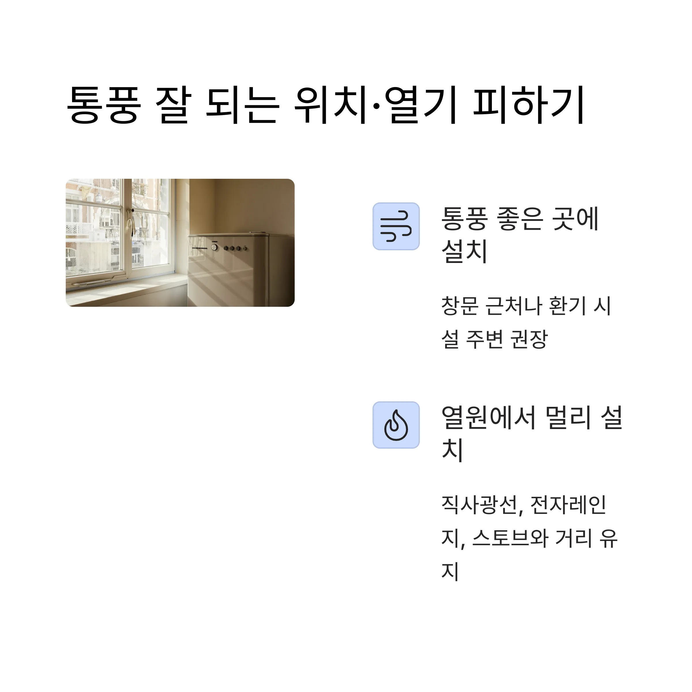 ✅ 통풍이 잘 되는 장소: 창문이 가까이 있거나 공기 흐름이 있는 곳이 좋아요.