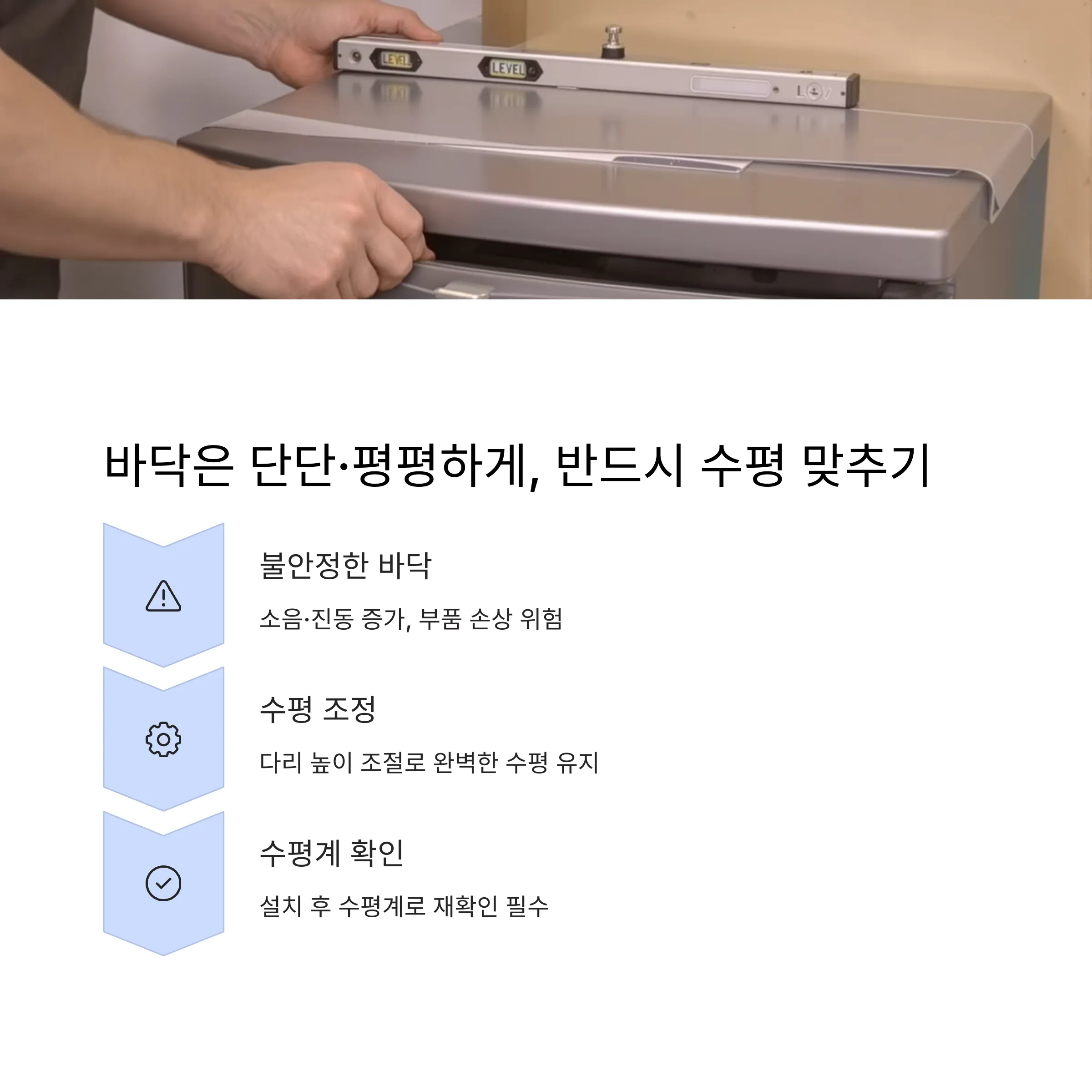 💡 TIP: 스마트폰 수평계 앱을 활용해서 냉장고가 제대로 수평을 이루고 있는지 확인해보세요! 저는 이걸로 확인하고 나서 왼쪽 다리를 살짝 높여주니 소음이 확 줄었어요.
